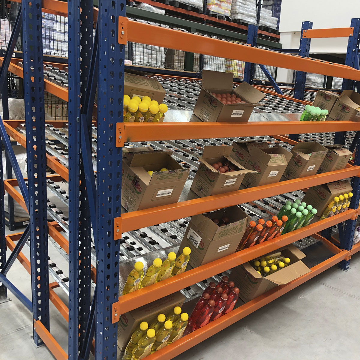 Uno de los más efectivos es el Racks Picking Carton Flow una estantería de gravedad con rodillos inclinados que permite: