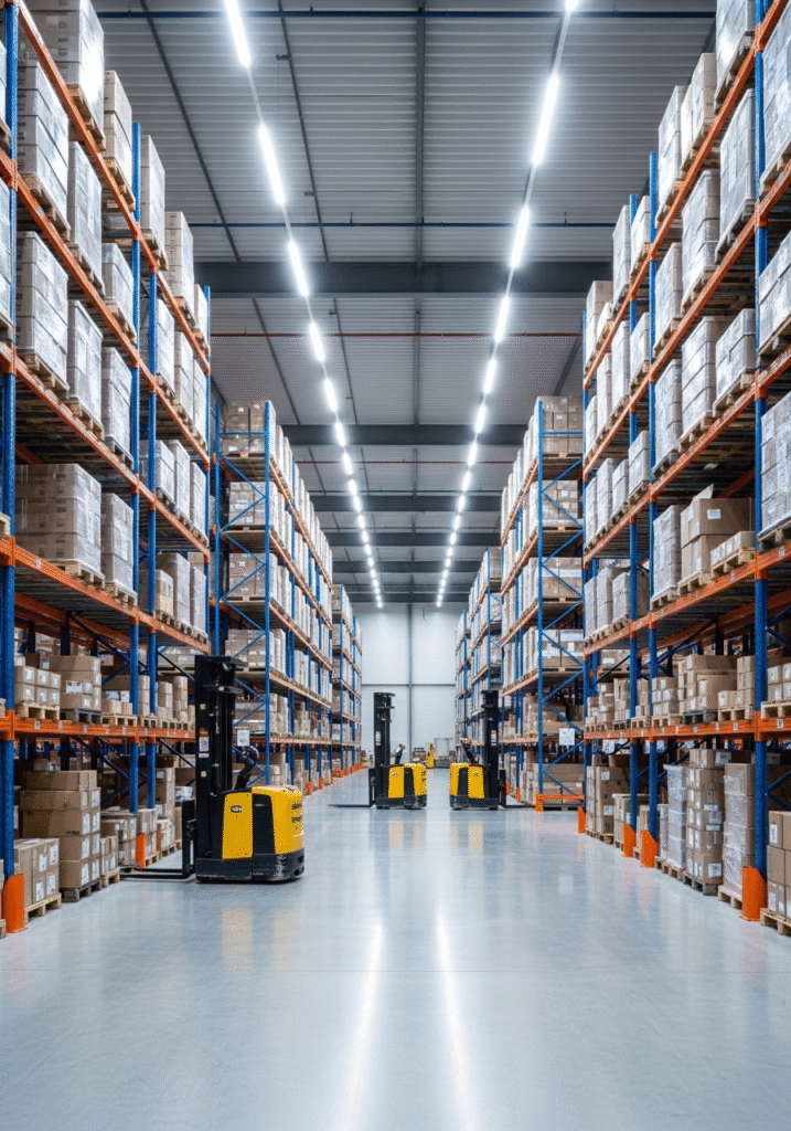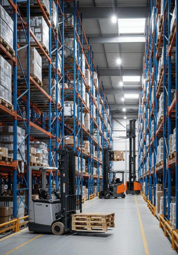 - Racks selectivos con pasillos optimizados para montacargas estándar.